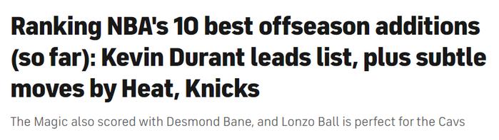 CBS评截至目前10佳运作:火箭引进杜兰特居首 从湖人挖DFS排第5